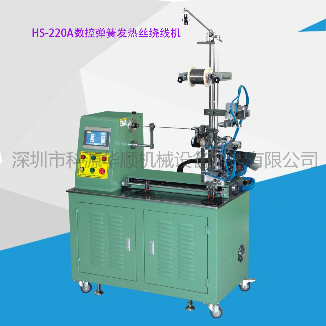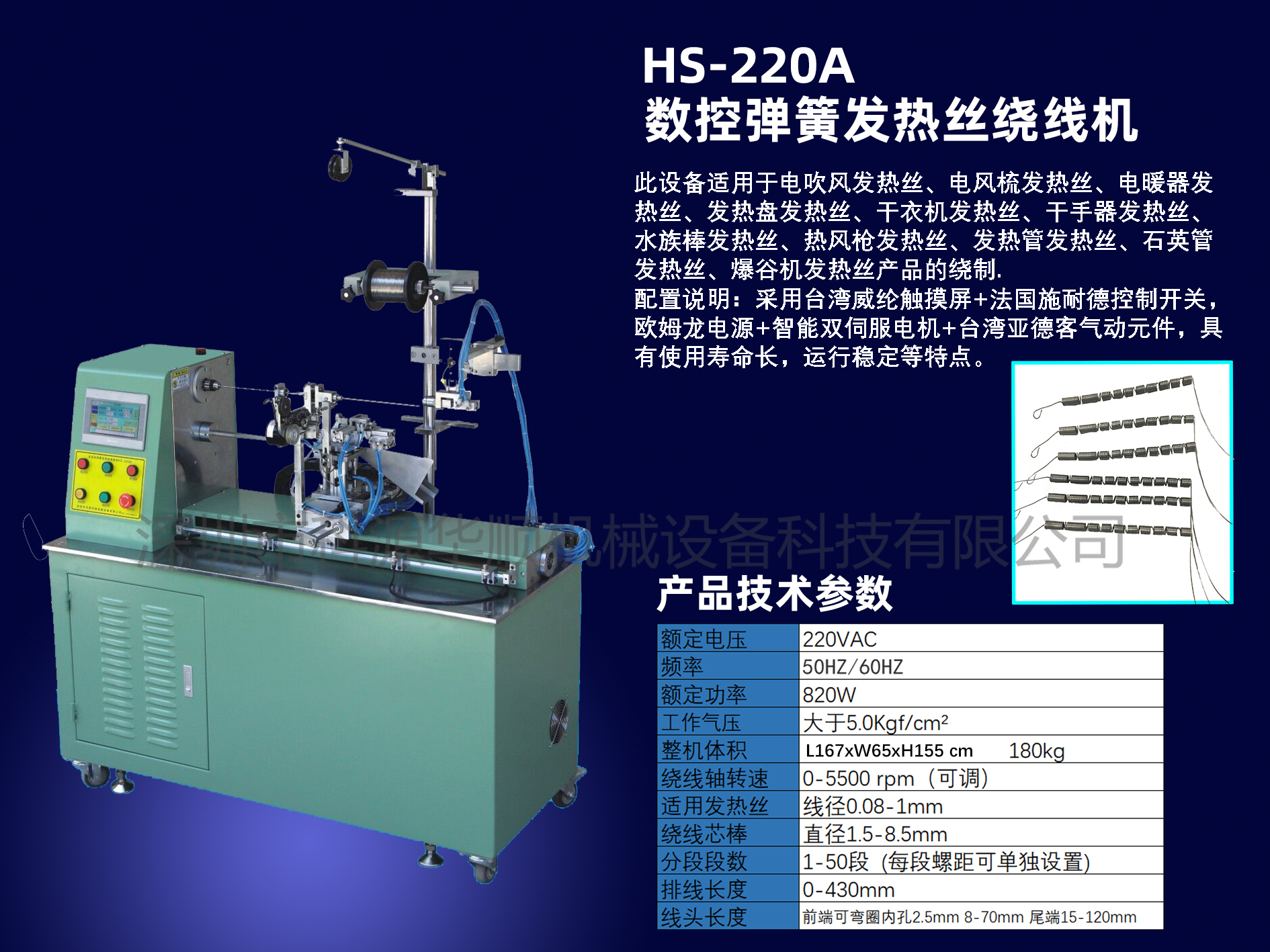 HS-220A数控弹簧发热丝绕线机适用于电吹风发热丝、电风梳发热丝、电暖器发热丝、发热盘发热丝、干衣机发热丝、干手器发热丝、水族棒发热丝、热风枪发热丝、发热管发热丝、石英管发热丝、爆谷机发热丝产品的绕制。